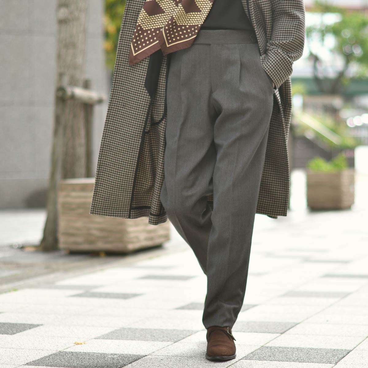 パンツはクラシカルなディテールと美しいシルエットのウールパンツ。シューズまで色を繋げば