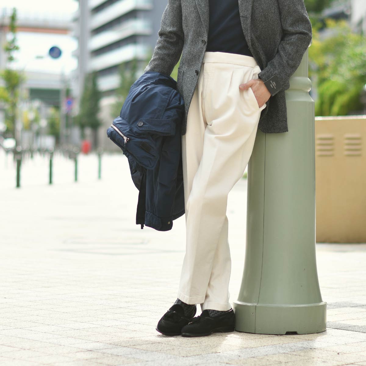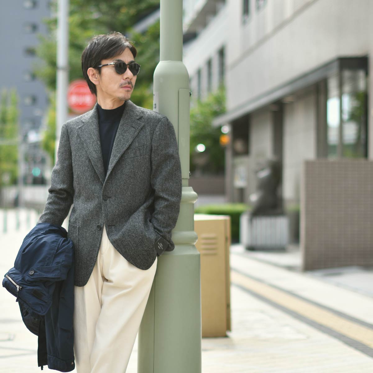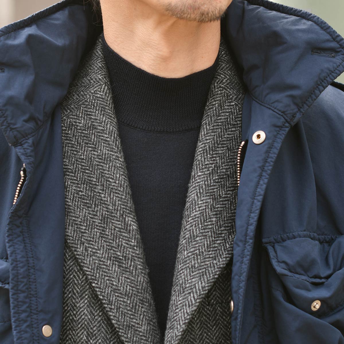 男臭いヘリンボーンに、すましたハイゲージのモックネック。