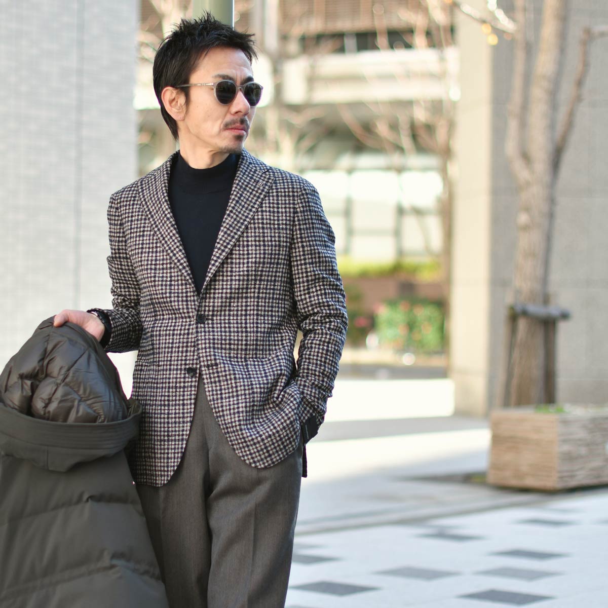 ジャケットには、アウター、ニットのそれぞれの色を拾うガンクラブチェック。