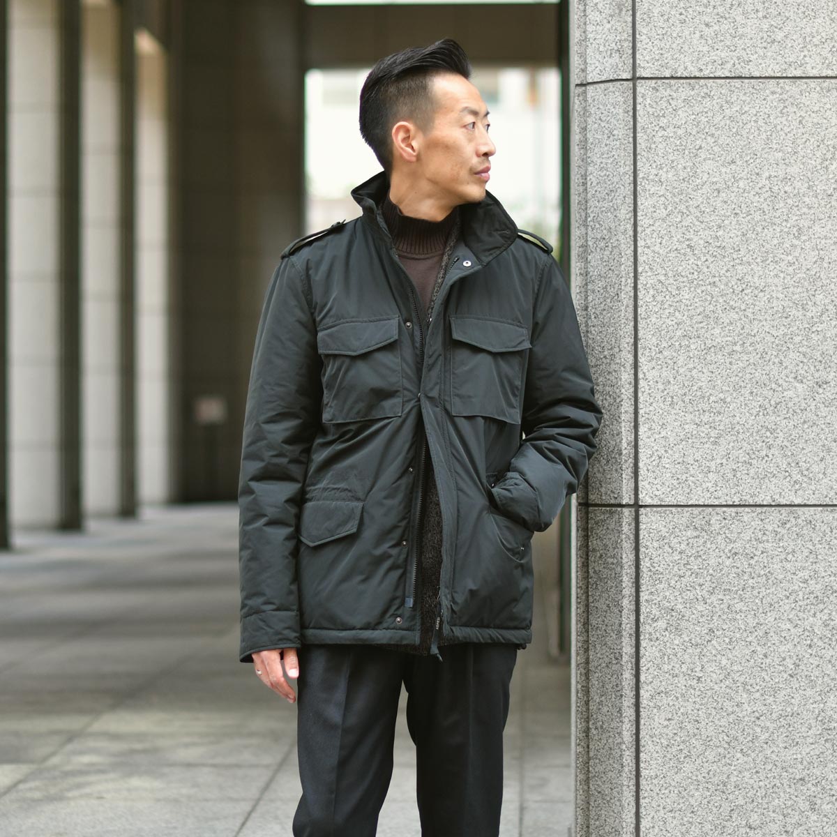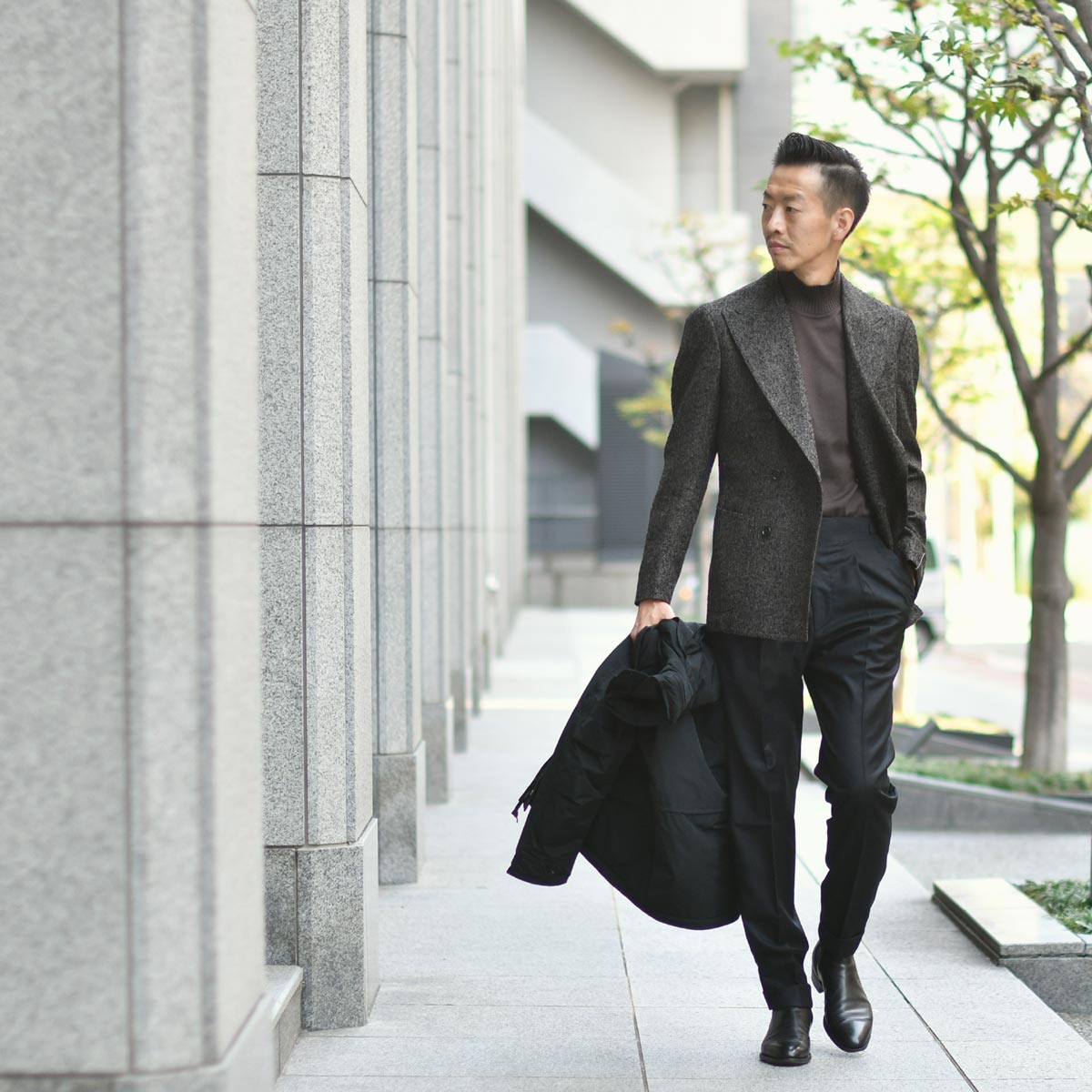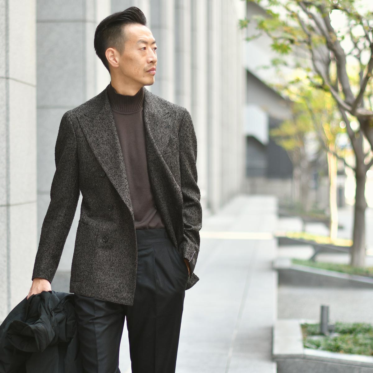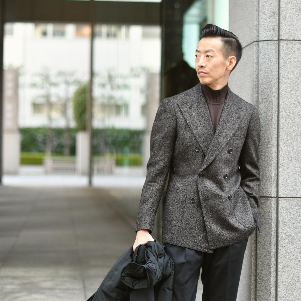 男らしいアウターに負けないよう、ジャケットは四者混のナッピングウールのような凝ったダブルブレスト。