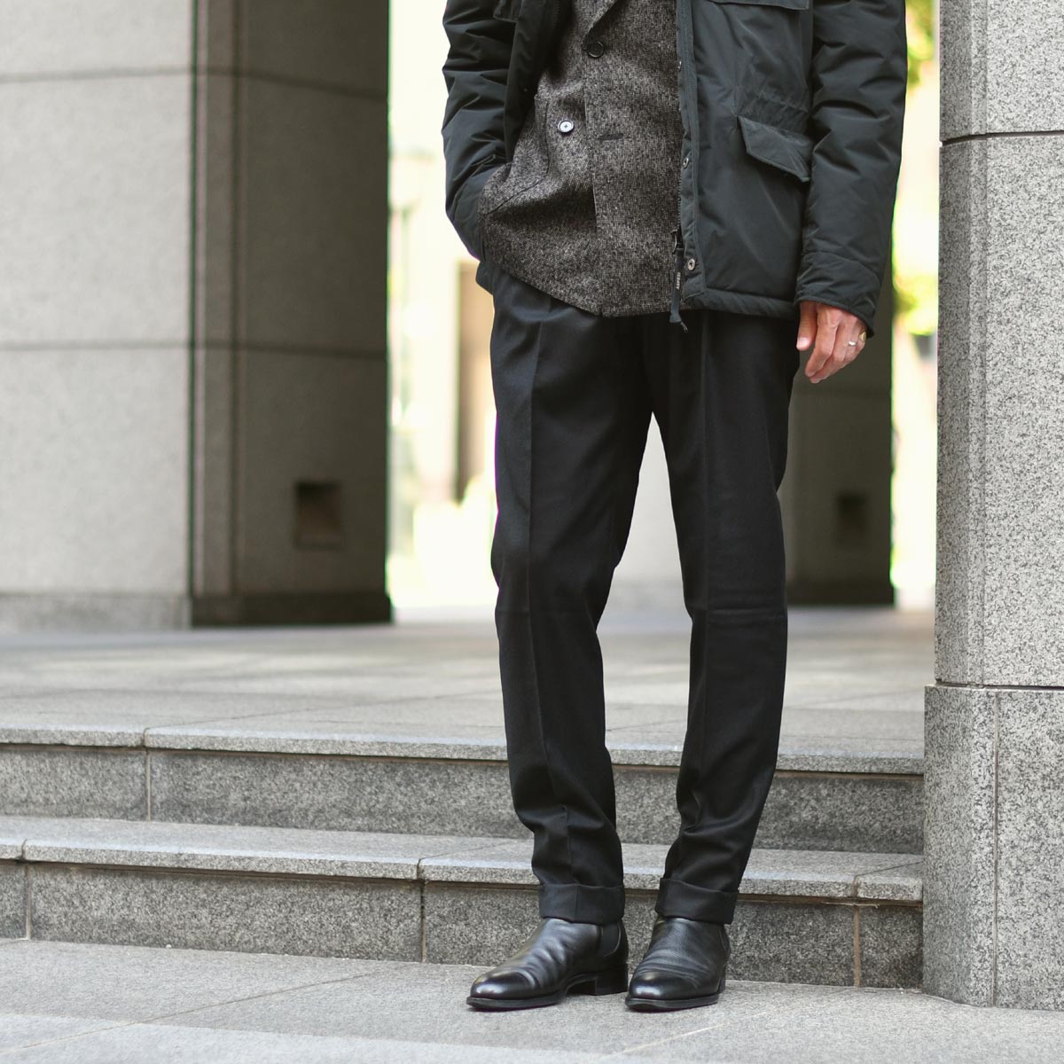ボトムスはシャープなブラックで統一。