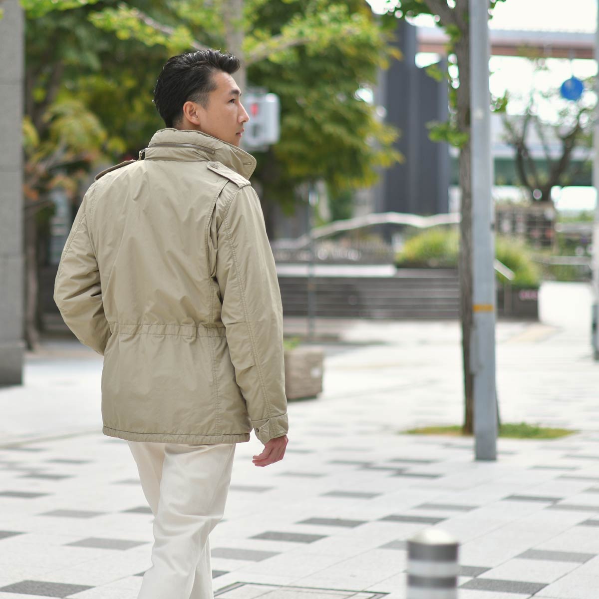 程よく風合いの効いたASPESI【アスペジ】M-65ですが、ベージュを採用することで武骨さや男臭さが抑えられやさし気な雰囲気に。