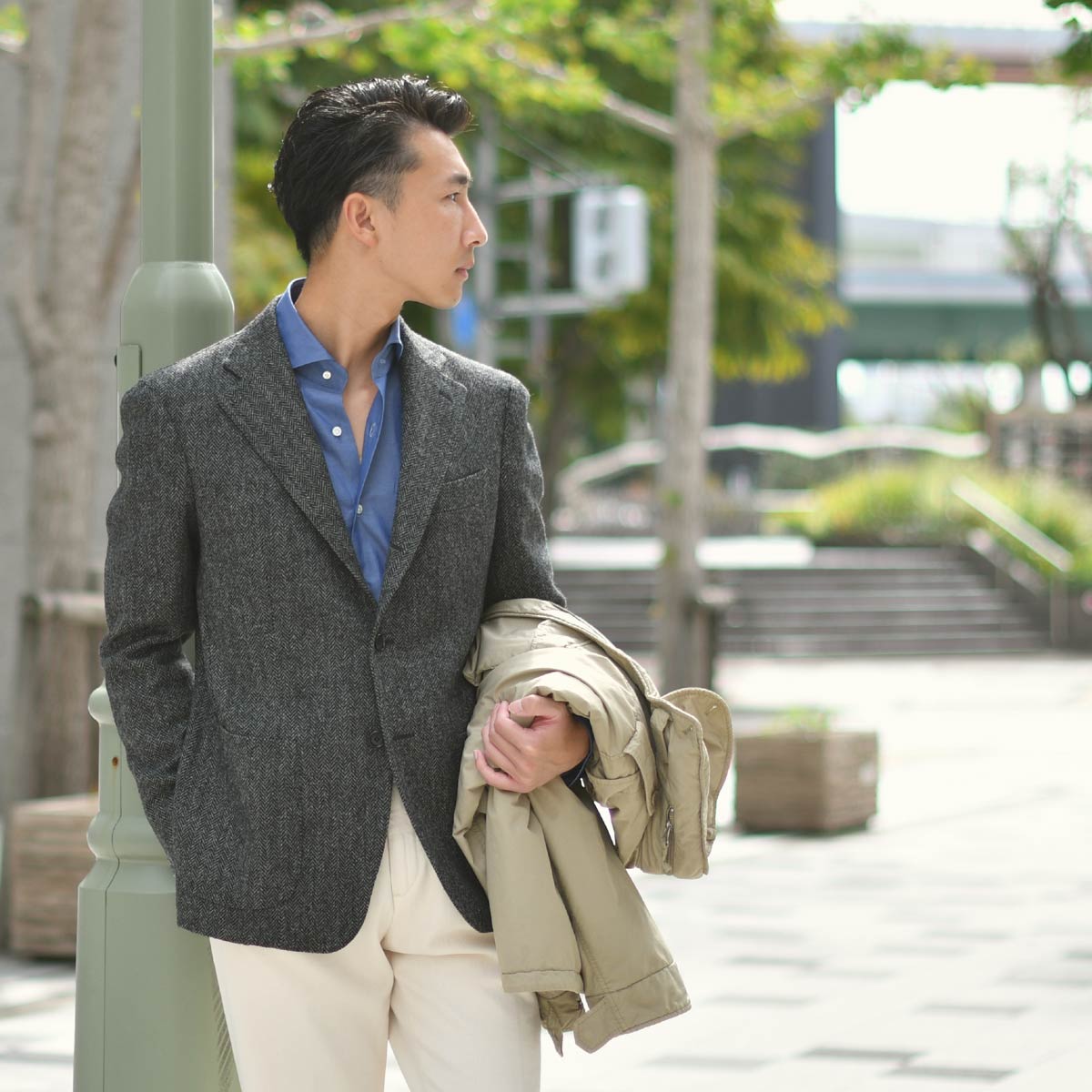 ツイーディなヘリンボーンジャケットはスポーティなアウターとも素材感の相性抜群。