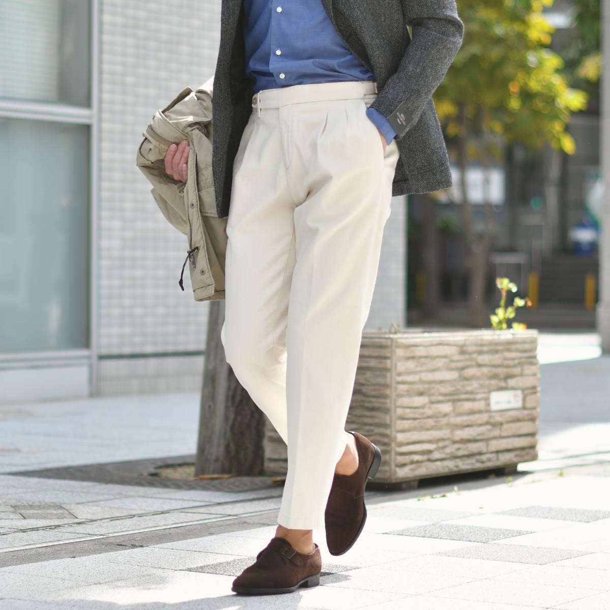 ドレッシーなシャツよりもシャンブレーシャツは素材感があって、アウター、ジャケットとの調和がとれるのではないでしょうか。