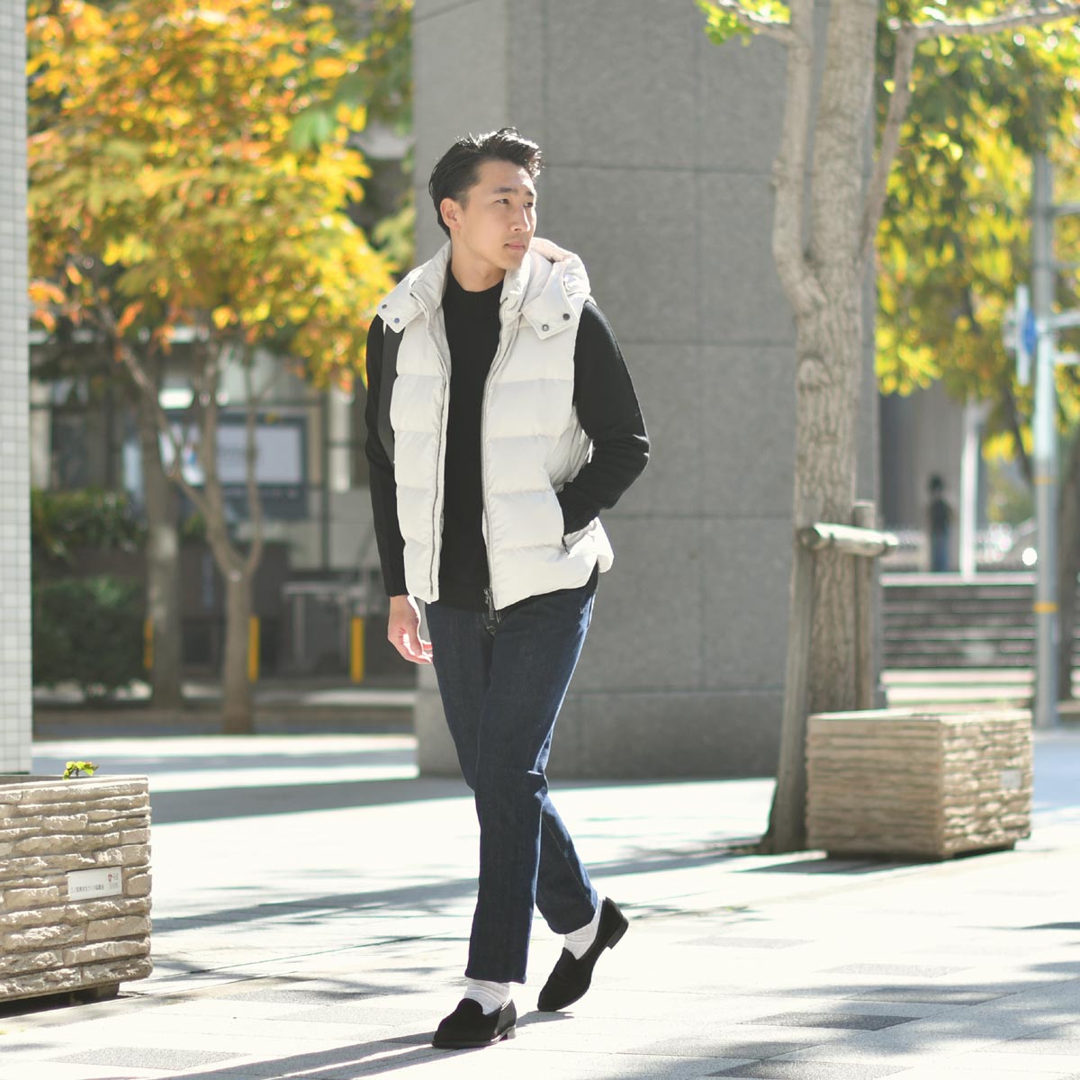 上半身のコーディネートは、ホワイトのアウターベストにブラックのミドルゲージモックネックニット。