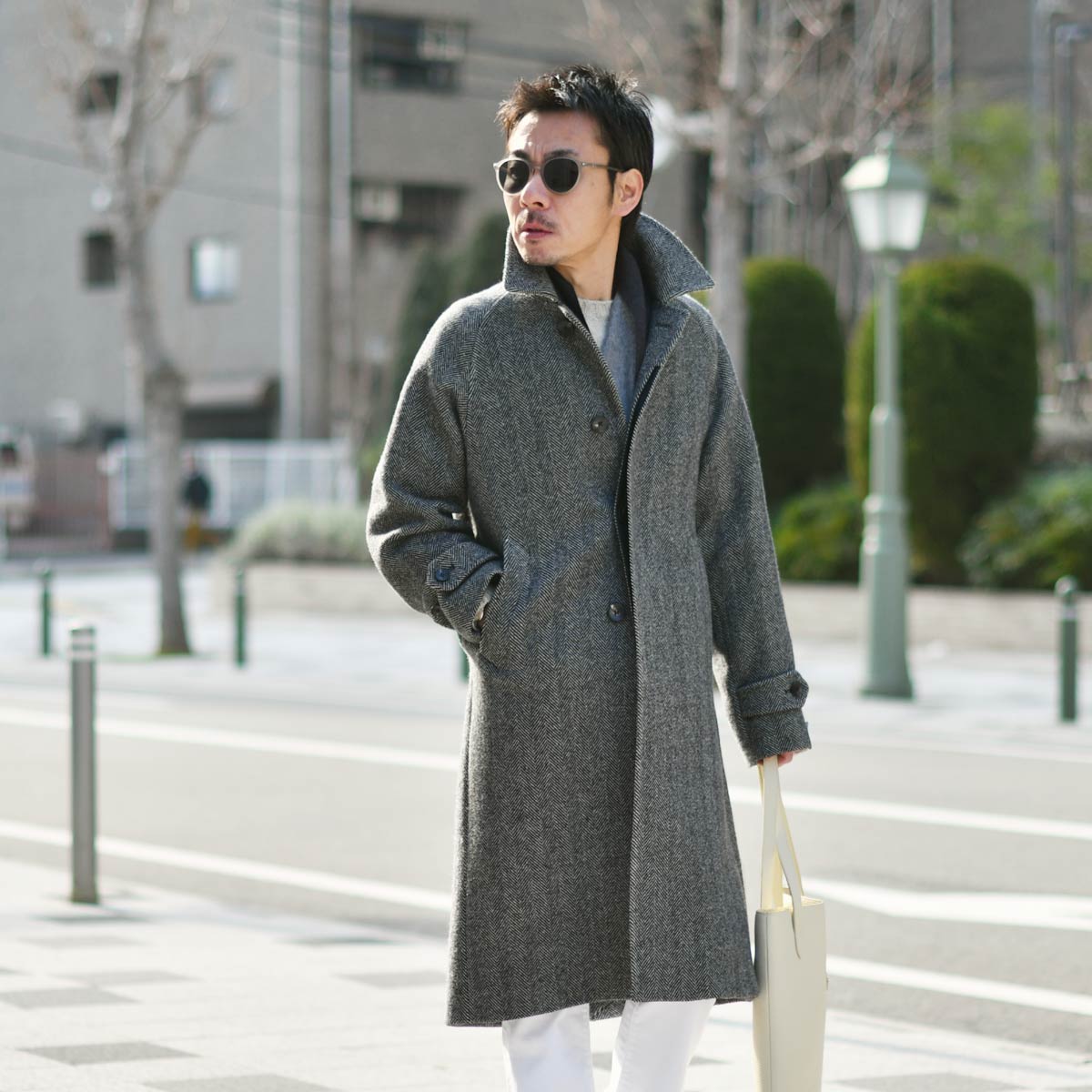 グレーヘリンボーン織のステンカラー、ラグランスリーブ。