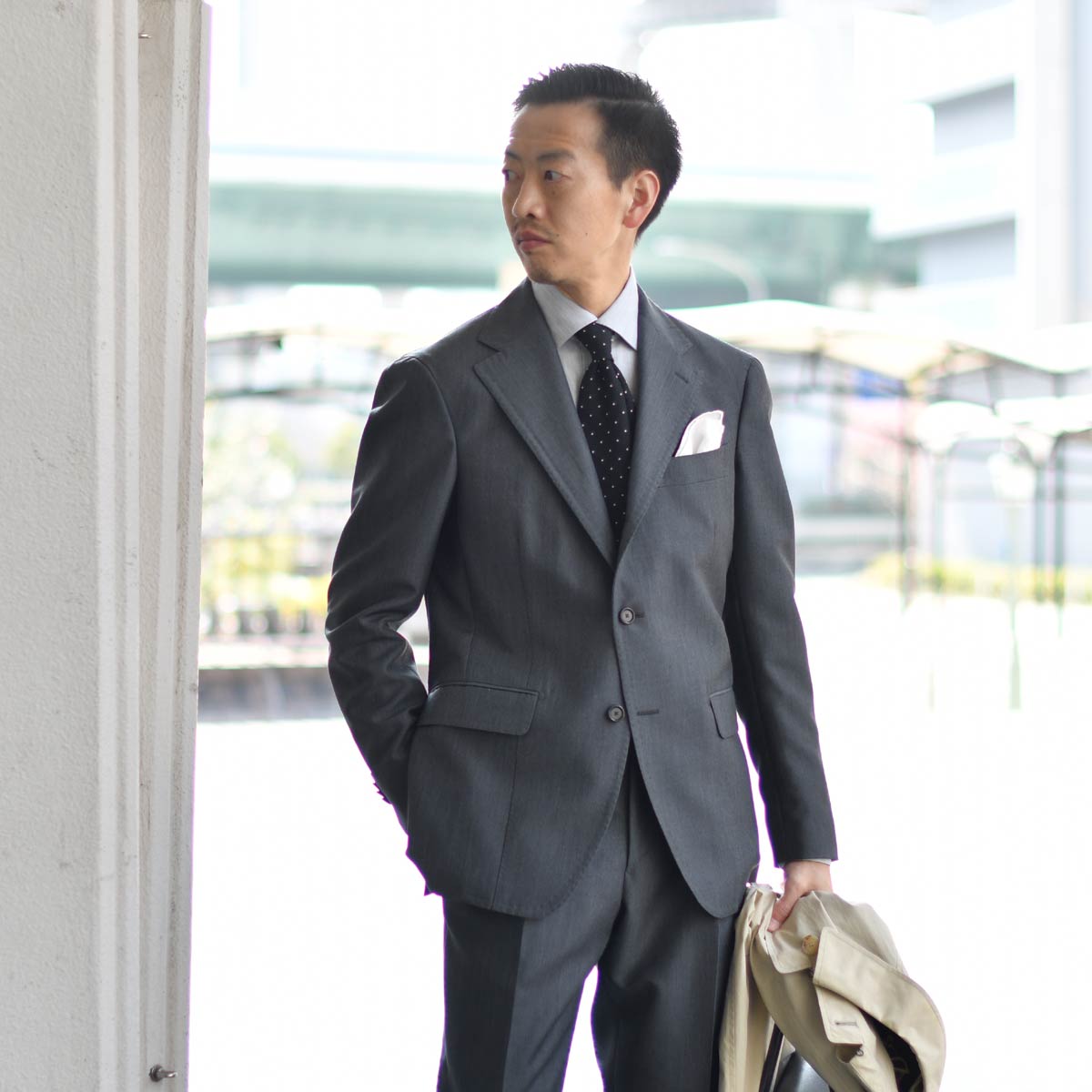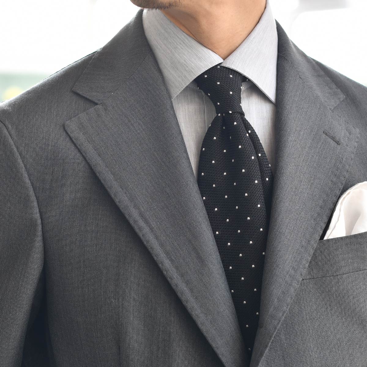 色合いも絶妙なグレーですので、ビジネスシーンはもちろんノータイもおすすめです。