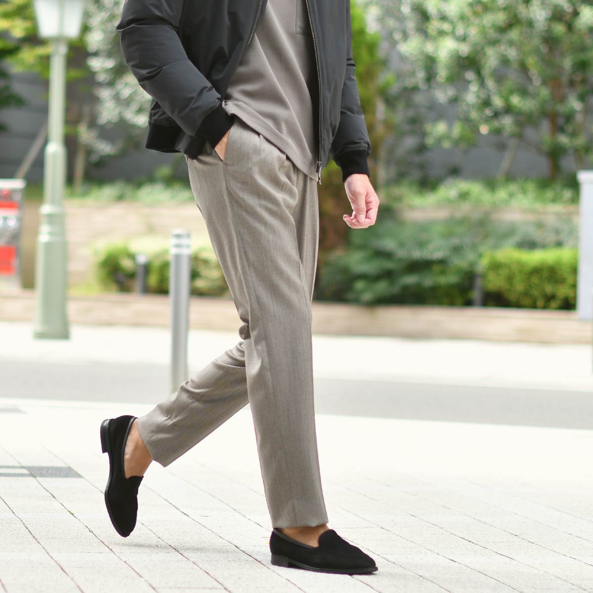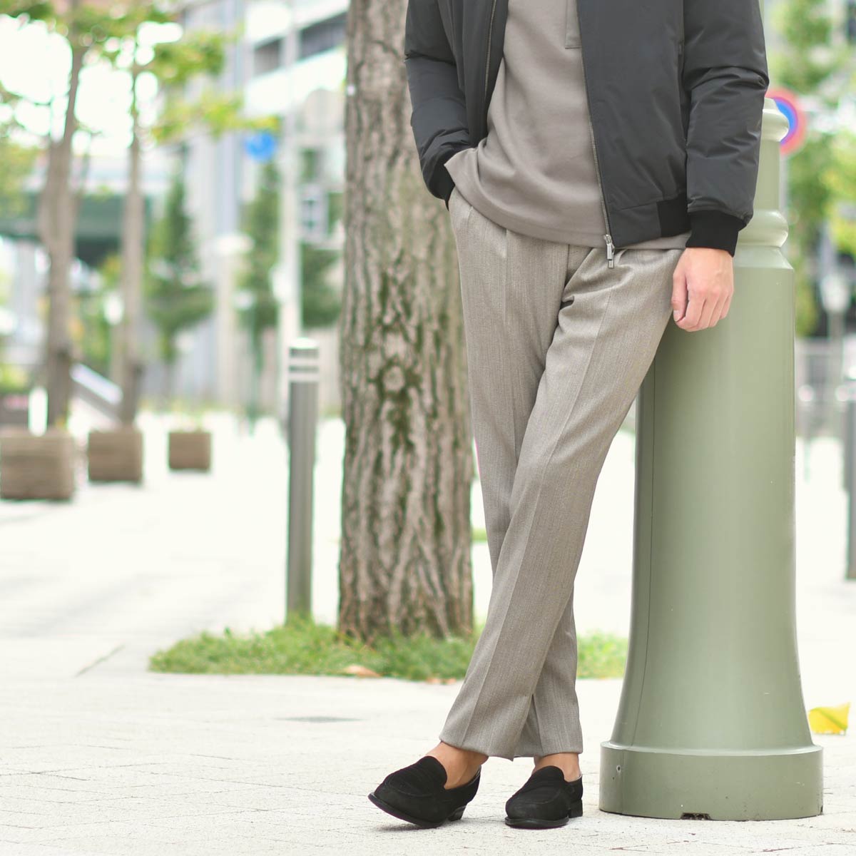 パンツをベージュのウール、シューズをブラックにすることで簡潔に色使いが整い、