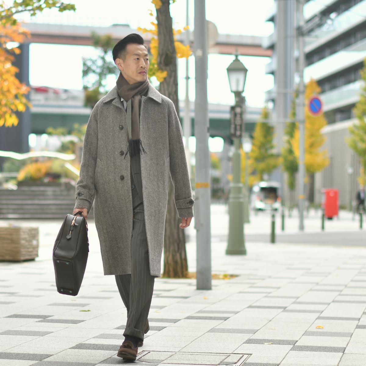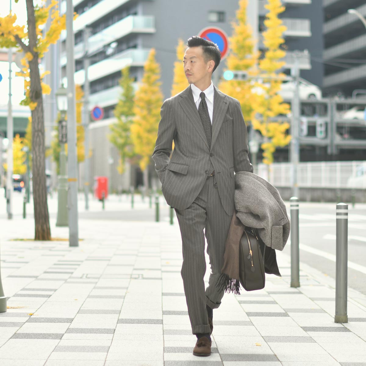 コートに合わせて少しくすんだグレイッシュブラウンのストライプスーツ。