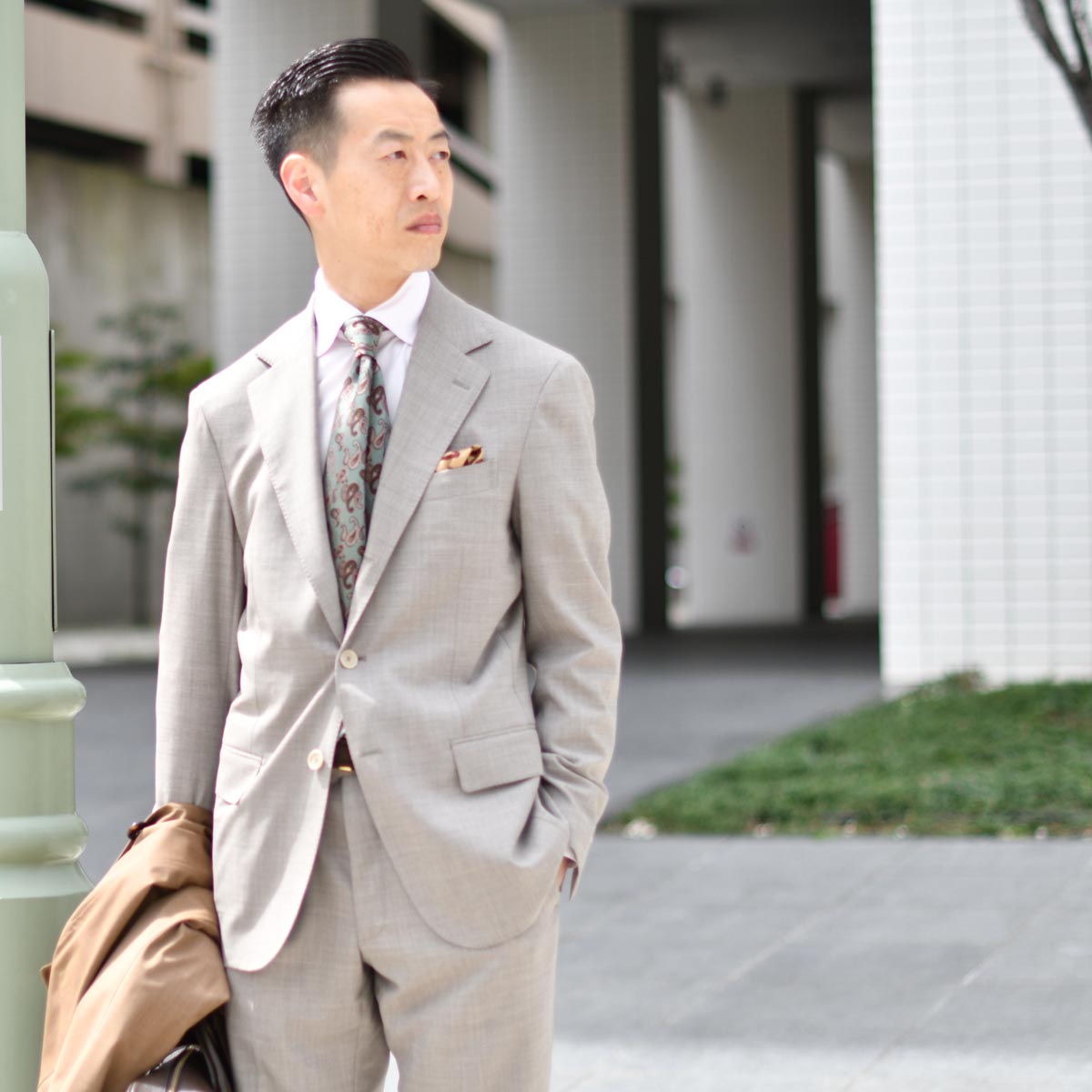 スーツもウールのベージュという上品さ。