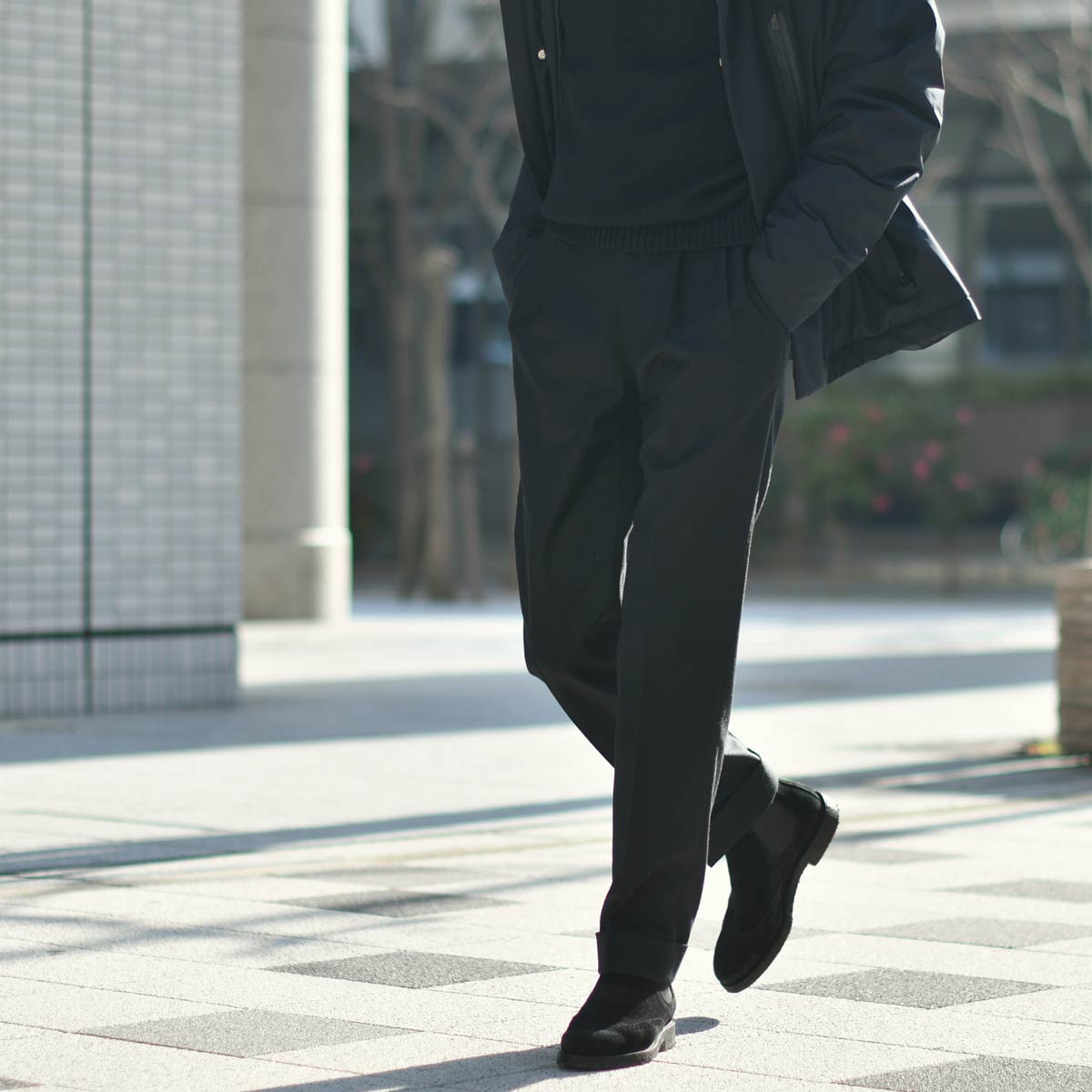 スポーティなブルゾンに対比させて、ウールのパンツで上品に。