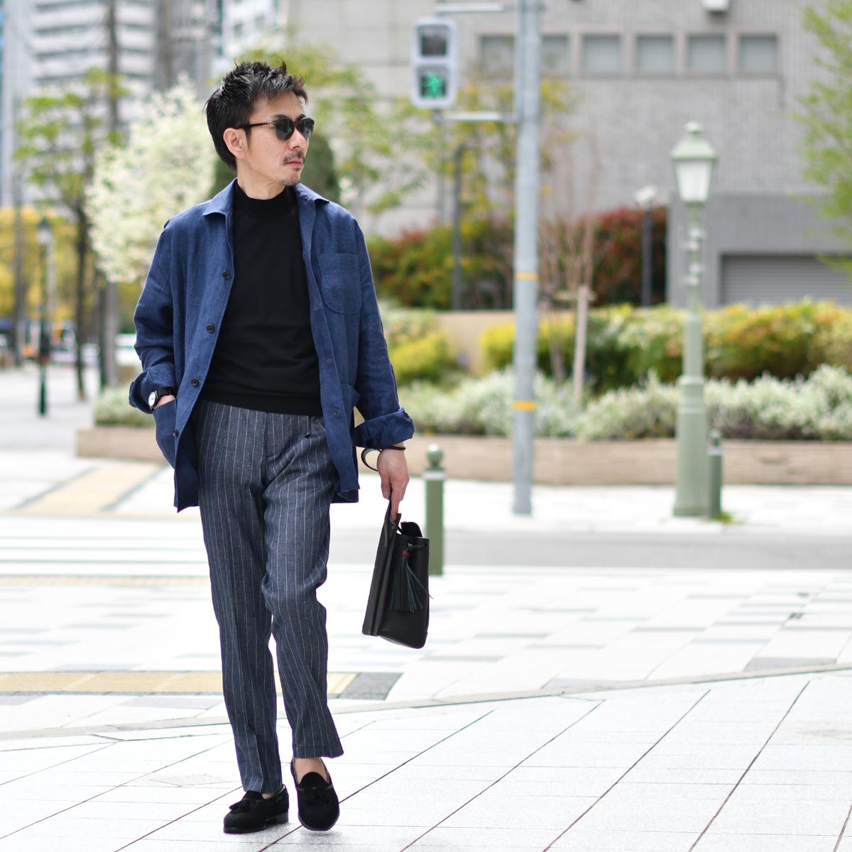 リネン特有のシワ感とドライな質感が、カチッとしすぎない「抜き」の美学を演出します。